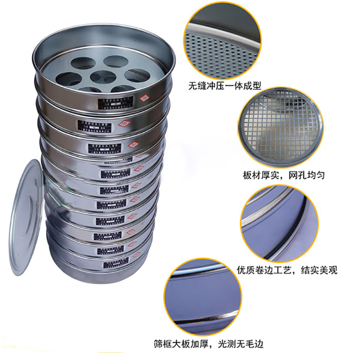 φ200mm (10只/套+底盖)0.075、0.25、0.5、1.0、2.0、5、10、20、40、60mm标准筛框材质:由不锈钢板、黄铜板、冷轧铁皮(镀铬或锌),塑料等材料构成。采用一次冲压成型,筛框平整、光洁度高、套筛组装互换。
